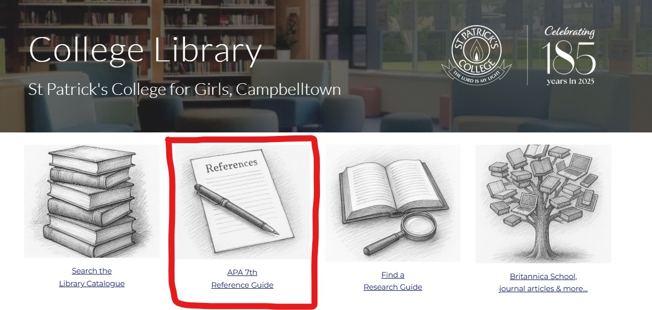 When you use information from a website, book, video (anywhere!) you must acknowledge where you got your information from, and you do this by referencing your work. At St Pat's, we use APA 7th edition to reference information sources. You can find the APA Reference Guide on the Library website: